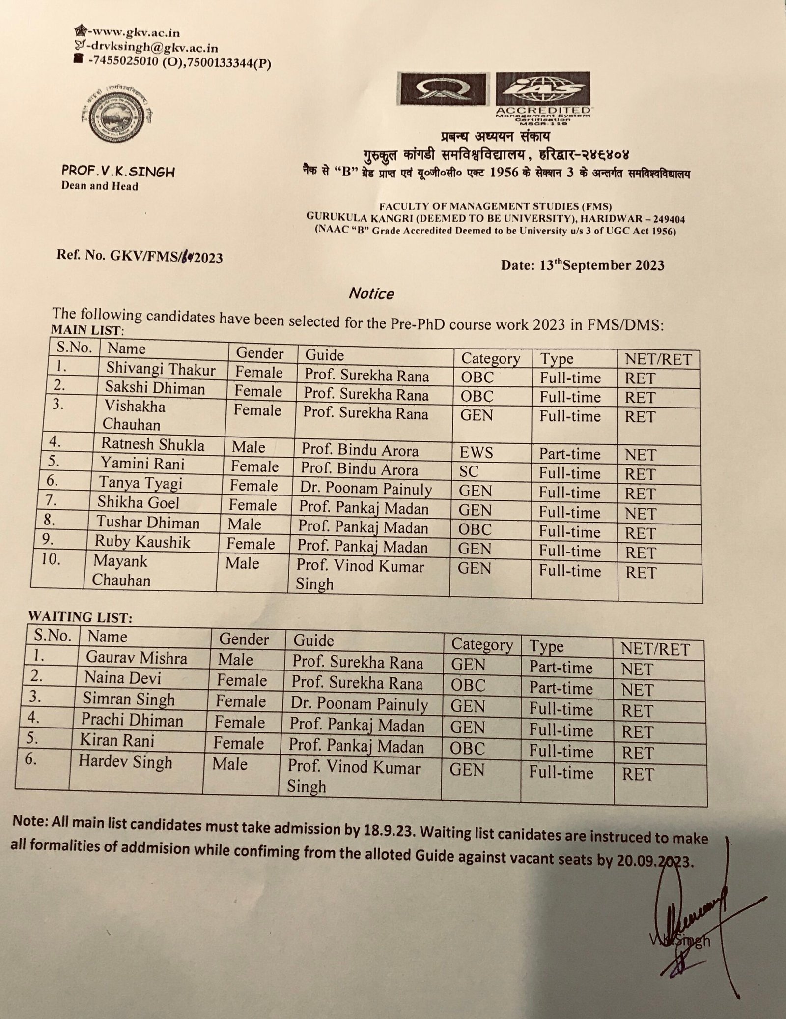 Selected Candidates for Pre-Ph.D. Coursework 2023 for Various Courses
