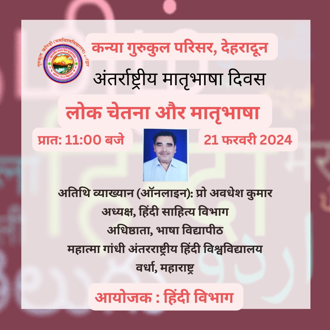 कन्या गुरुकुल परिसर, देहरादून के हिन्दी विभाग द्वारा “अंतर्राष्ट्रीय मातृभाषा दिवस” (21 फरवरी, 2024) के अवसर पर ‘लोक चेतना और मातृभाषा’ विषय पर व्याख्यान का आयोजन किया जा रहा है।
