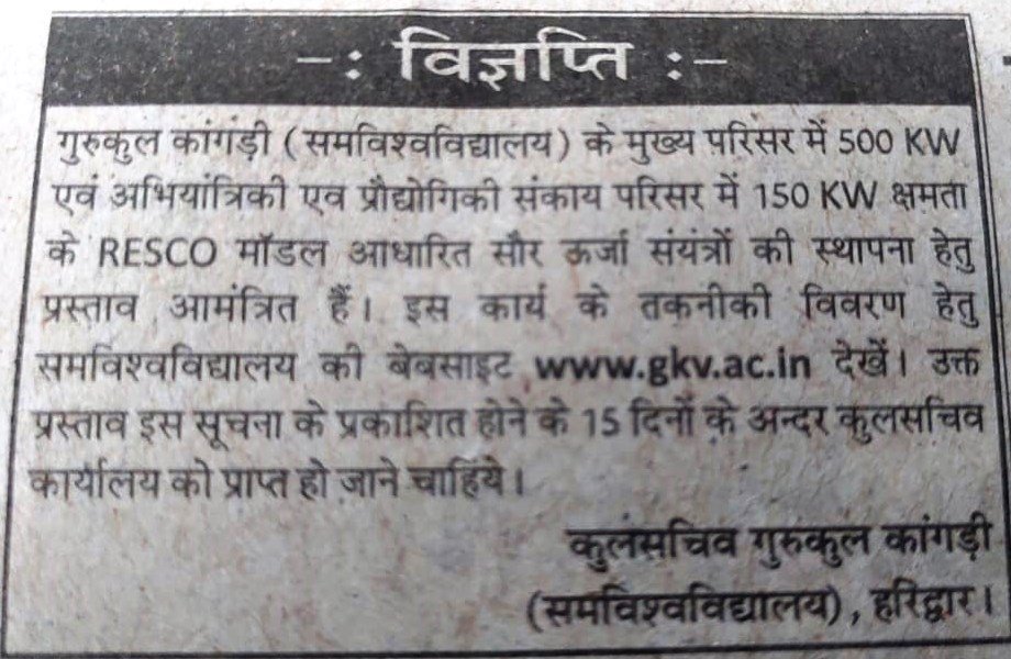 | Grid Connected Solar Systems on Rooftops of Gurukula Kangri (Deemed to be University) | Registrar, Gurukula Kangri Viv. | Gurukula Kangri (Deemed to be University) | Extended to 27, July 2021 till 05:00 PM | AdvertisementExpression of InterestExpression of Interest(Signed) |